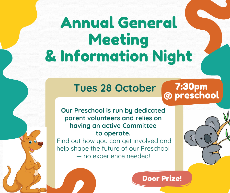 We’re excited to invite you to our Annual General Meeting (AGM) and Information Night, to be held at the Preschool on Tuesday, 28 October at 7:30 PM.